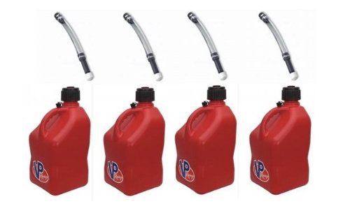 4 Pack Red VP 5 Gallon Racing Fuel Jugs and 4 Deluxe HosesIncludes: 4 Pack New VP 5 Gallon Red Race Fuel Jugs Holds over 5 gallons of fuel Level markings on outside of jug 4 VP Racing Fuel Deluxe Jug Hoses Kit is in stock and ships today!